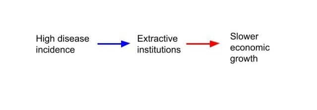 In a sense, the variation in death rates provided the randomisation required to explore the effect of institutions. Of course other factors will influence the existence of institutions.